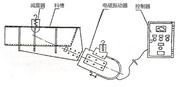 電磁振動(dòng)給料機(jī)的激振器電磁線圈的電流是經(jīng)過(guò)單相半波整流的,當(dāng)線圈接通后在正半周內(nèi)有電流通過(guò),銜鐵和鐵芯之間便產(chǎn)生了脈沖電磁力互相吸引,這時(shí)槽體向后運(yùn)動(dòng),激振器的主彈簧發(fā)生變形儲(chǔ)存了一定的勢(shì)能,在負(fù)半周線圈中無(wú)電流通過(guò),電磁力消失,主彈簧釋放能量,使銜鐵和鐵芯朝反方向離槽體向前運(yùn)動(dòng)。于是電磁振動(dòng)給料機(jī)以交流電源的頻率往復(fù)振動(dòng),由于槽體的底平面與激振力作用線有一定的夾角,因此槽體的物料沿拋物線的軌跡連續(xù)不斷地向前運(yùn)動(dòng)。調(diào)整整流電壓的高低,即可控制設(shè)備的送料量。